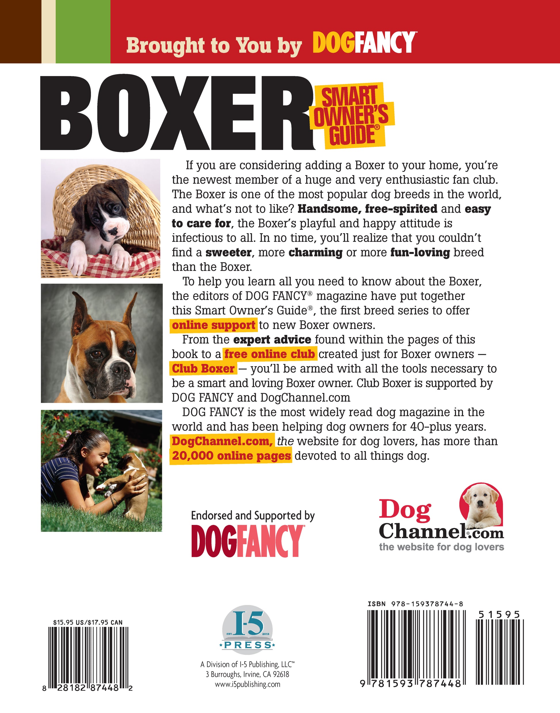 Dedicated to the world’s most versatile and handsome working breed, the Boxer, this Smart Owner’s Guide, created by the editors at Dog Fancy magazine, offers the most up-to-date and accurate information every dog owner needs to become a well-informed caregiver for his dog. Illustrated with color photographs of adorable puppies and handsome adults, this easy-to-read primer is designed in a modern, lively manner that readers will find user-friendly and entertaining.Each Smart Owner’s Guide offers a description of the breed’s character and physical conformation, historical overview, and its attributes as a companion dog. The reader will find informative chapters on everything he or she needs to know about acquiring, raising, and training this remarkable purebred dog, including: finding a breeder and selecting a healthy, sound puppy; preparing for the puppy’s homecoming, shopping for supplies, and puppy-proofing the home; house-training; veterinary and home health maintenance; feeding and nutrition; and grooming. Obedience training for basic cues (sit, stay, heel, come, etc.) and solving potential problem behaviors (barking, chewing, aggression, jumping up, etc.) are addressed in separate chapters, as are activities to enjoy with the dog, including showing, agility, therapy work, and more.Entertaining tidbits and smart advice fill up colorful sidebars in every chapter, which the editors call ?It’s a Fact,” ?Smart Tip,” ?Notable & Quotable,” and ?Did You Know?” Real-life heroes and rescue stories are retold in full-page features called ?Pop Pups” and ?True Tails.” Recipes, training, and care tips are highlighted in the ?Try This” feature pages.The Smart Owner’s Guide series is the only series that offers readers an online dogchannel.com. At Club Boxer, owners of the breed can find forums, blogs, and profiles to connect with other breed owners, as well as charts and checklists that can be downloaded. More than just 20,000 pages of solid information, there’s a host of fun to be had at the club in the form of downloadable breed-specific e-cards, screensavers, games, and quizzes.The Resources section of the book includes contact information for breed-related organizations and rescues, as well as practical guidance on traveling with dogs, identification, and locating qualified professionals to assist the dog owner, such as pet sitters, trainers, and boarding facilities. This information-packed Smart Owner’s Guide is fully indexed.