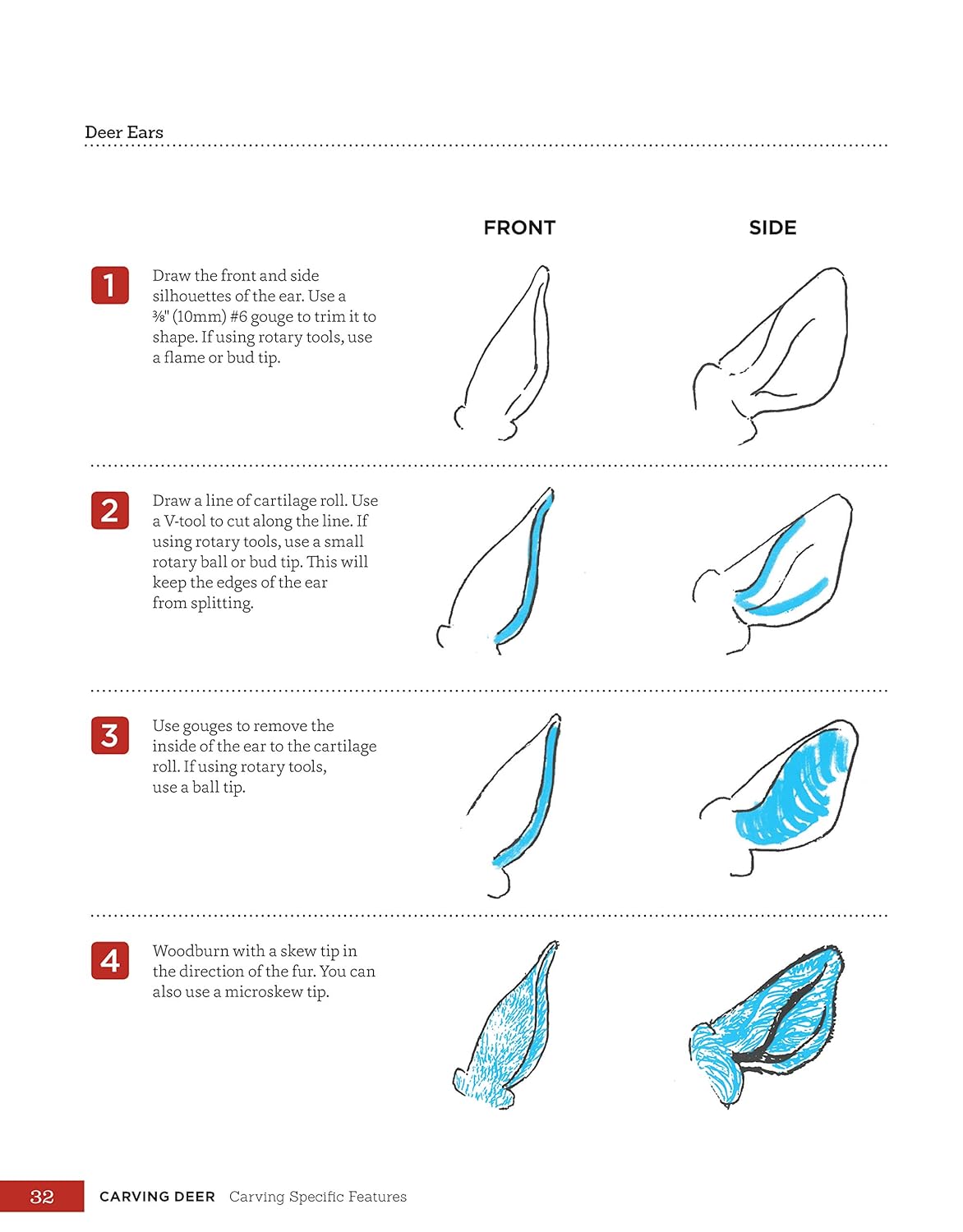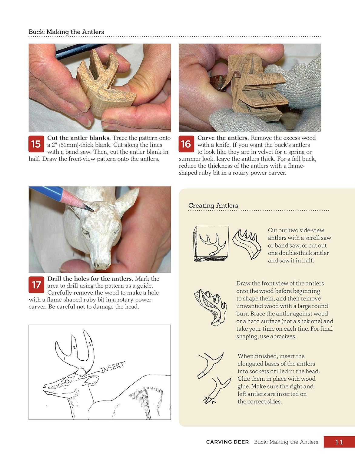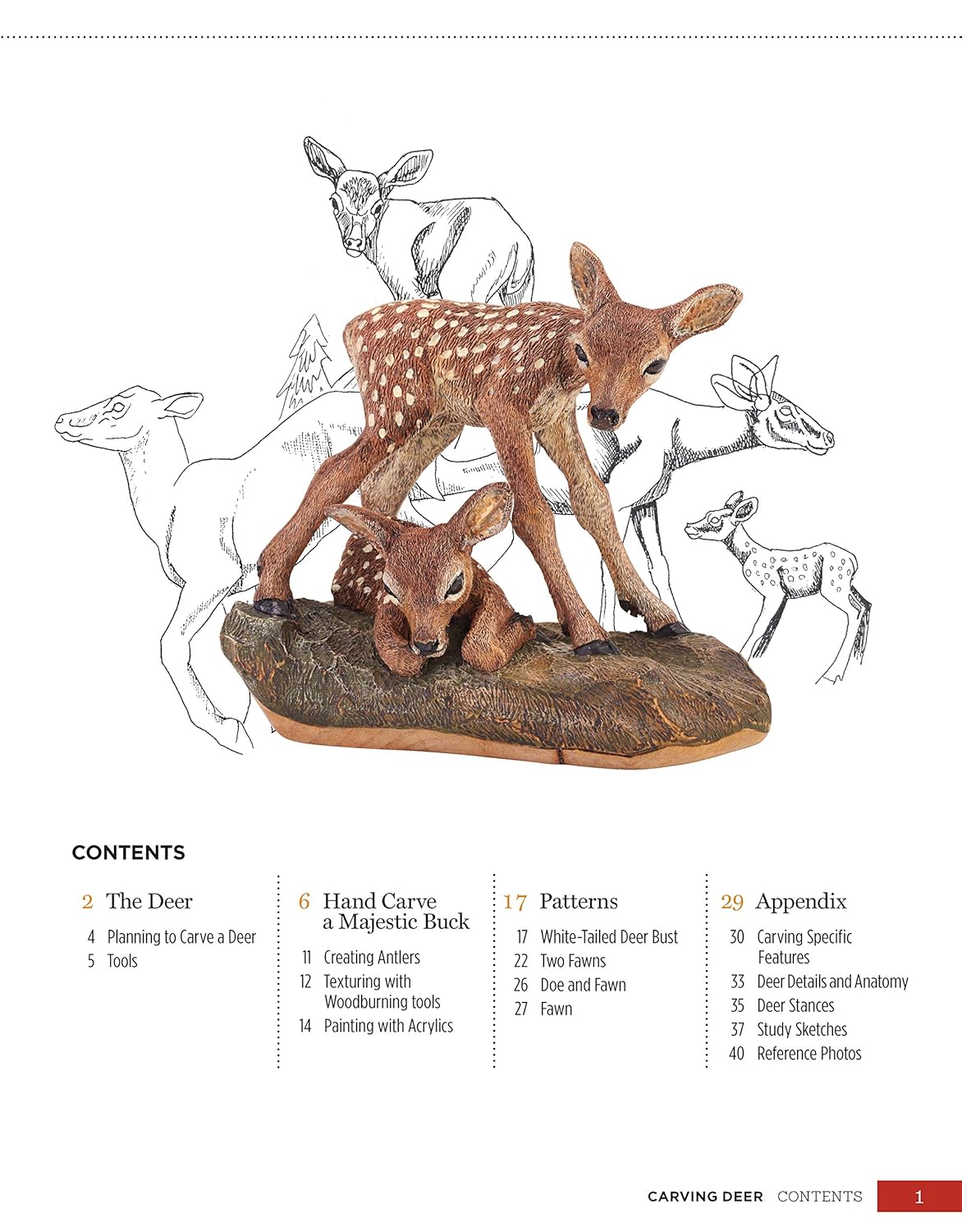 Join award-winning woodcarver Desiree Hajny as she reveals her artistic approach to carving majestic white-tailed deer. Desiree is well known for her lifelike, richly detailed animal carvings. Now she shares her knowledge and carving secrets with you in this handy reference guide.Celebrate the natural beauty of wild deer as you create your own magnificent woodcarvings. Inside you’ll find ready-to-use carving patterns for making beautifully realistic bucks, does, and fawns. Clear reference photos provide inspiring views of deer from all angles, and color-coded anatomy sketches help you to understand how they move. The author offers expert tips for carving challenging details like eyes, nose, and mouth, along with texturing, painting, and finishing techniques.