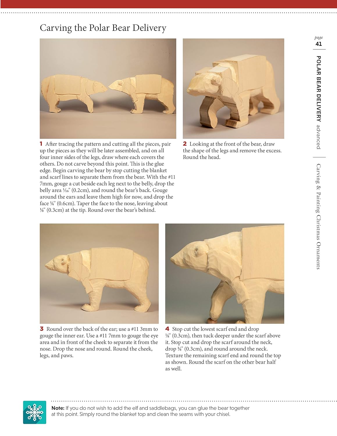 Get inspired to create a wonderful collection of handmade holiday decorations for a child or grandchild to treasure. Popular woodcarving teacher and author Betty Padden shows how to carve memorable ornaments to keep or give to family and friends. Imagine a tree decorated with your own beautifully wood carved Christmas ornaments consisting of angels, elves, polar bears, poinsettias, and more. You’re sure to have a merry time with 6 fun wood carving projects, color photographs, and 23 original patterns. Step-by-step projects are divided into three categories—beginning, intermediate, and advanced. A special section on painting covers basic concepts of blending, highlighting and shading, so that even a novice can get great results. The best ornaments on the holiday tree are always those that are handmade. Giving these hand-carved Christmas ornaments will be almost as much fun as making them!