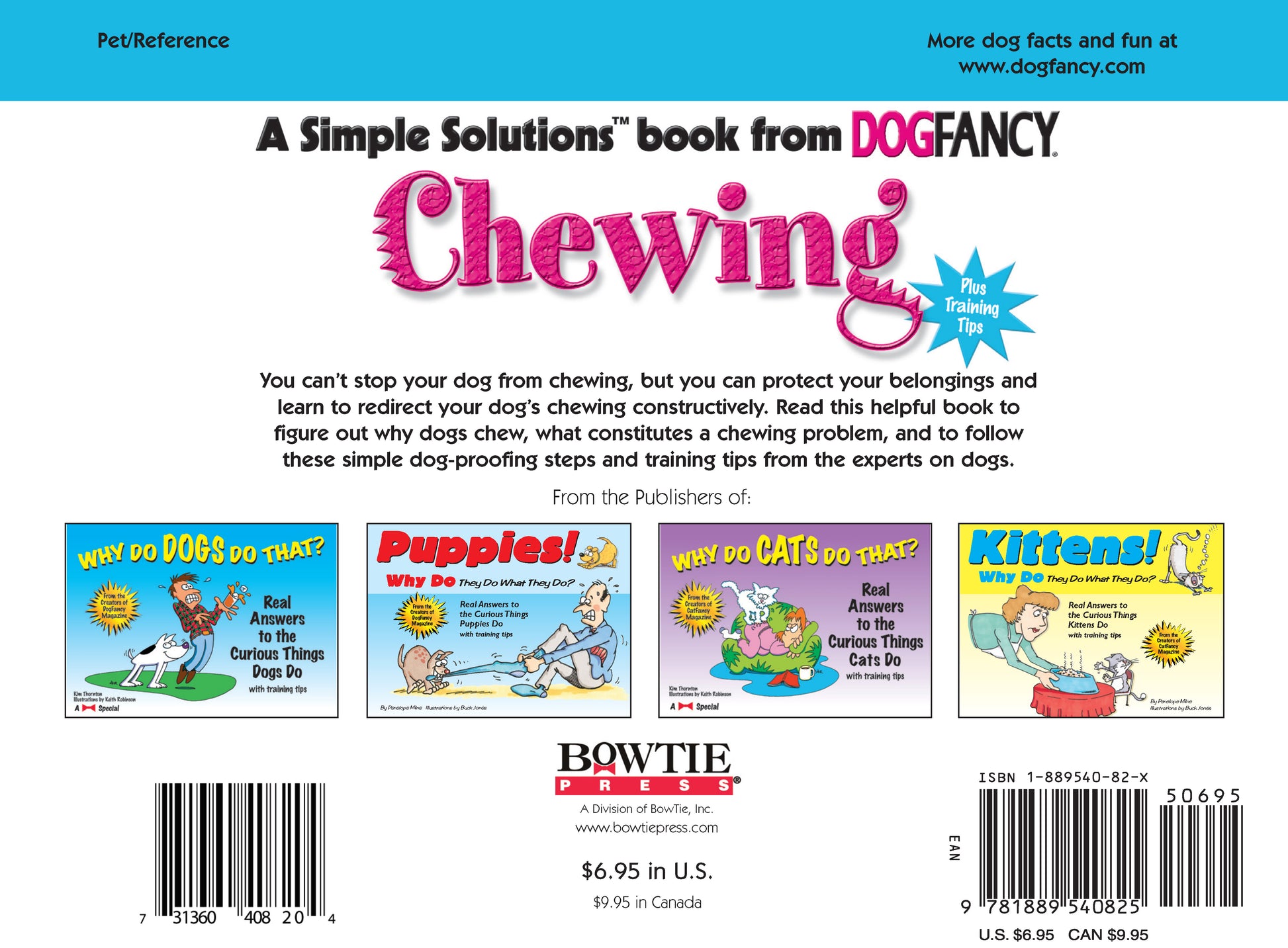 This Simple Solutions book is dedicated to topic  of chewing, one of the dog’s favorite pastimes and one of the problems that cost dog owners the most aggravation and money. For owners of mouthy puppies (or adults), Chewing offers excellent way of extinguishing the problem through redirection, rewards, and providing other stimulation (toys, games, and other distractions!). Author Kim Campbell Thornton also guides the dog owner to prevent chewing problems through every-day routines that discourage the behavior. Readers will be entertained by the humorous illustrations by Buck Jones.