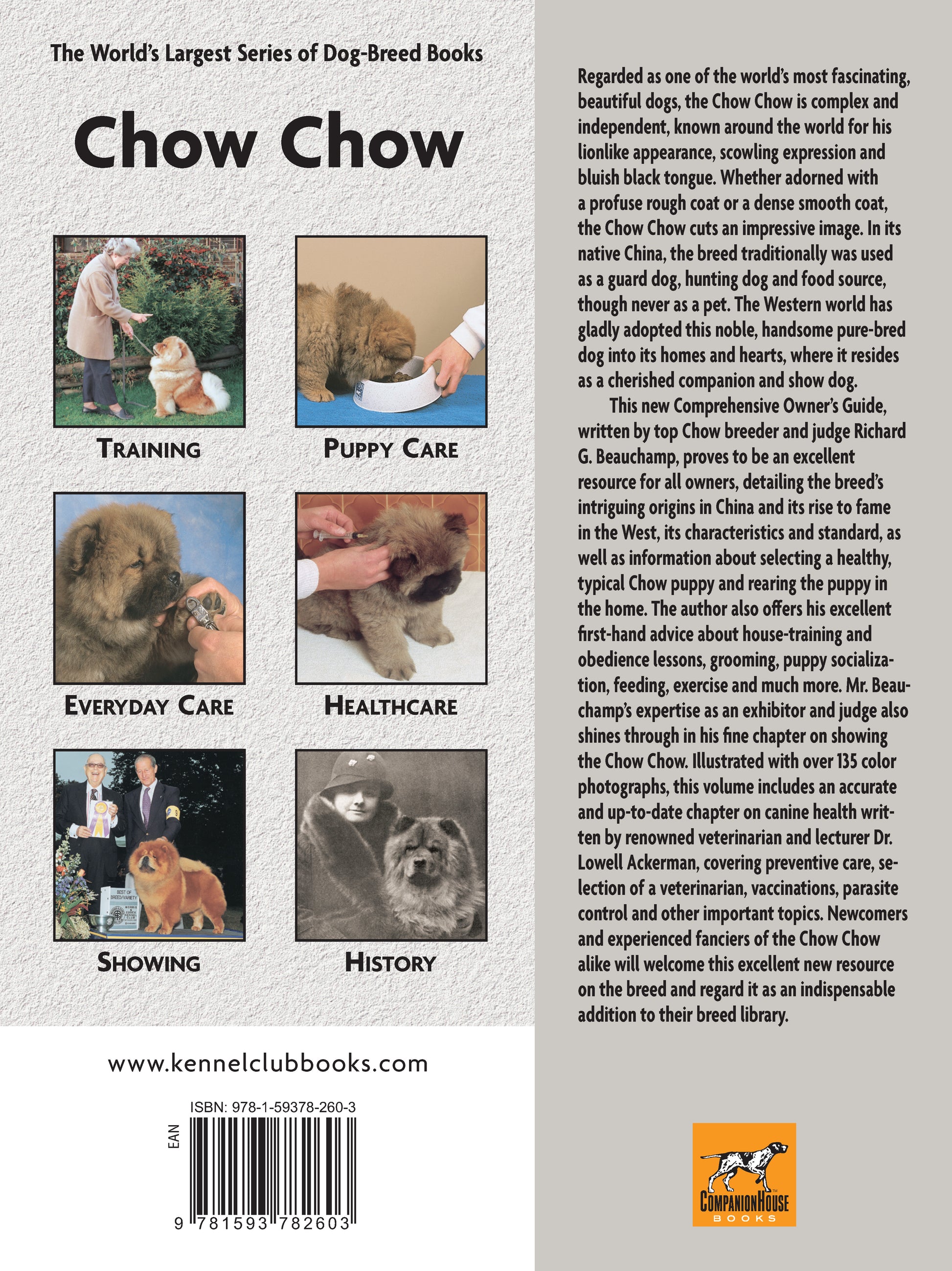 The enigmatic Chow Chow continues to fascinate humankind with his complex, independent nature, his scowling expression, and his unmistakable purebred nobility. Whether adorned in the characteristic rough coat or a dense smooth coat, the Chow never hesitates to reveal his bluish black tongue, one of the breed’s most celebrated traits. As a show dog, the Chow cuts an impressive image: powerful, sturdy, and squarely built. Of Nordic origins, this medium-size breed was developed for various purposes, including hunting, herding, pulling carts, and protecting the home. Today’s Chows are cherished home companions for the right owners willing to put in the time to socialize and train this distinctive purebred dog. Richard G. Beauchamp, long associated with the Chow and other Non-Sporting breeds, has written an excellent primer on the Chow Chow breed, offering readers a glimpse into the breed’s mysterious past in China and his many elusive charms. New owners will welcome the well-prepared chapter on finding a reputable breeder and selecting a healthy, sound puppy. Chapters on puppy-proofing the home and yard, purchasing the right supplies for the puppy as well as house-training, feeding, and grooming are illustrated with photographs of handsome adults and puppies. In all, there are over 135 full-color photographs in this useful and reliable volume. The author’s advice on obedience training will help the reader better mold and train into the most well-mannered dog in the neighborhood. The extensive and lavishly illustrated chapter on healthcare provides up-to-date detailed information on selecting a qualified veterinarian, vaccinations, preventing and dealing with parasites, infectious diseases, and more. Sidebars throughout the text offer helpful hints, covering topics as diverse as historical dogs, breeders, or kennels, toxic plants, first aid, crate training, carsickness, fussy eaters, and parasite control. Fully indexed.