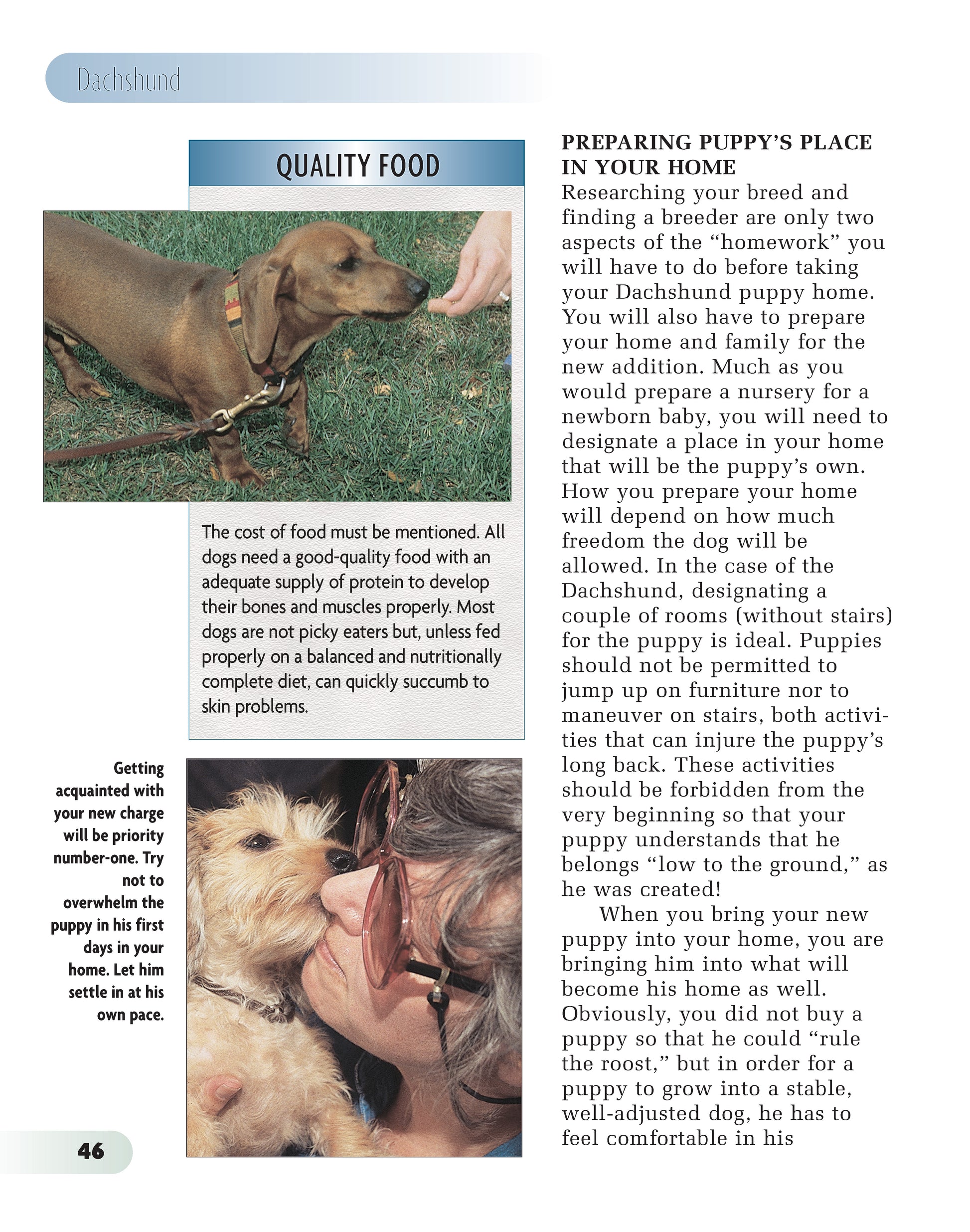 Few breeds trigger as much pride as the Dachshund, as only Dachshund people understand why this breed is superior to all others! Any Dachshund owner will explain it to you, as will author Ingrid Schwartz, an owner of Dachshunds for many generations. This Comprehensive Owner’s Guide dedicated to Germany’s Teckel (or weiner dog, as he’s sometimes affectionately called) paints a vivid portrait of this dwarf-sized scenthound originally bred to hunt badger, surely a calling that requires a determined, feisty fellow. Although many Dachshund folk deny it (you can’t blame them for their loyalty), Dachshunds may be the most stubborn canines on the planet and they’re not for everyone, even though there are many varieties to choose from. The chapter dedicated to the breed’s characteristics discusses not only the breed’s two sizes and three coat types but also its comical, intelligent, and determined personality.New owners will welcome the well-prepared chapter on finding a reputable breeder and selecting a healthy, sound puppy. Chapters on puppy-proofing the home and yard, purchasing the right supplies for the puppy as well as house-training, feeding, and grooming (all three coat types) are illustrated with photographs of handsome adults and puppies. In all, there are over 135 full-color photographs in this useful and reliable volume. The author’s advice on obedience training will help the reader better mold and train into the most well-mannered dog in the neighborhood. The extensive and lavishly illustrated chapter on healthcare provides up-to-date detailed information on selecting a qualified veterinarian, vaccinations, preventing and dealing with parasites, infectious diseases, and more. Sidebars throughout the text offer helpful hints, covering topics as diverse as historical dogs, breeders, or kennels, toxic plants, first aid, crate training, carsickness, fussy eaters, and parasite control. Fully indexed.