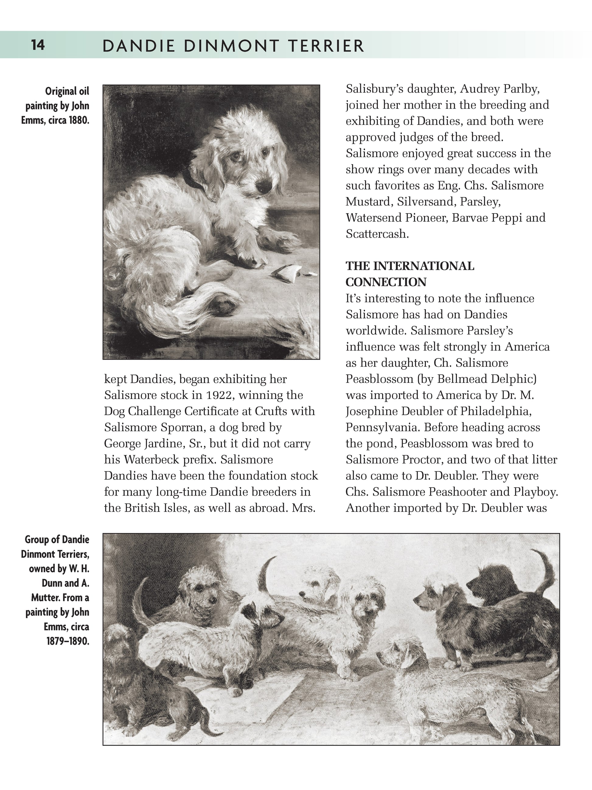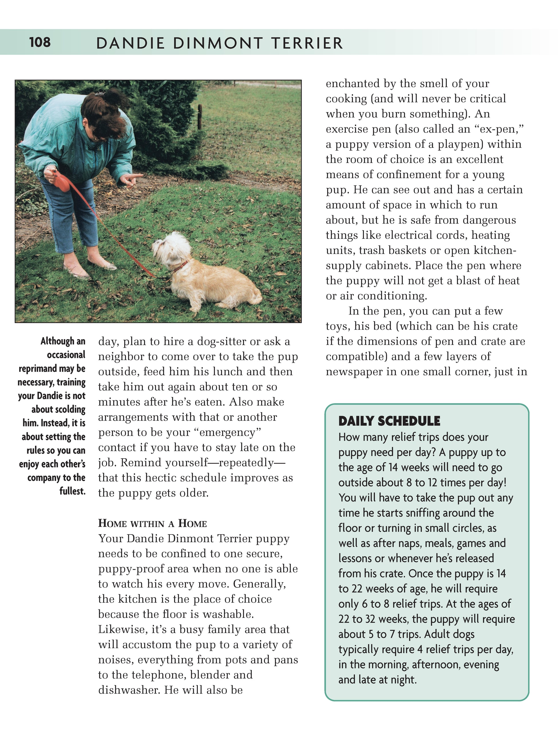 Unmistakably unique in his crisp coat colored in mustard or pepper, the Dandie Dinmont Terrier cuts a silhouette without compare in dogdom. His large, distinctive head crowned with a silky topknot; his full, round eyes, revealing intelligence and sensitivity; and his long, low, shapely body, and short legs add to the breed’s unmistakable distinction and purity. Although the Dandie is counted among the gamest of working terriers, the breed’s gentleman-like ways, independent spirit, and special brand of dignified affection recommend him as a charming companion dog for all experienced dog owners. Author Betty-Anne Stenmark, one of the doyennes of the breed in the United States, a highly regarded breeder and judge, begins this Comprehensive Owner’s Guide with a detailed chapter on the breed’s origins in England and the United States, featuring many historical photographs of important dogs. As only a lifelong Dandie lover can do, the author conveys the ineffable spirit and temperament of her favorite dog in an enjoyable chapter on the breed’s characteristics, which all newcomers to the breed will find enlightening and entertaining. The AKC breed standard is presented alongside the author’s expert analysis, making this book indispensable to all serious Dandie students.New owners will welcome the well-prepared chapter on finding a reputable breeder and selecting a healthy, sound puppy. Chapters on puppy-proofing the home and yard, purchasing the right supplies for the puppy as well as house-training, feeding, and obedience are illustrated with photographs of handsome adults and puppies. Guest author Emma Greenway, a Dandie expert and breeder from down under, provides two excellent sections on the proper grooming of the Dandie and training the puppy for show. In all, there are over 135 full-color photographs in this useful and reliable volume.. The chapter on healthcare provides up-to-date detailed information on selecting a qualified veterinarian, vaccinations, preventing and dealing with parasites, infectious diseases, and more. Sidebars throughout the text offer helpful hints, covering topics as diverse as historical dogs, breeders, or kennels, toxic plants, first aid, crate training, carsickness, fussy eaters, and parasite control. Fully indexed.