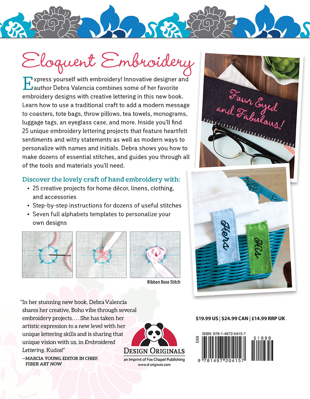 Express yourself with embroidery! Innovative designer and author Debra Valencia combines some of her favorite embroidery designs with creative lettering in this new book. Learn how to use a traditional craft to add a modern message to coasters, tote bags, throw pillows, tea towels, monograms, luggage tags, an eyeglass case and more. Inside Embroidered Lettering you’ll find 25 fun and unique embroidery lettering projects that feature heartfelt sentiments and witty statements. Debra provides step-by-step instructions for 24 useful stitches, useful advice on tools and materials, and 7 alphabet templates to use in customizing your own designs.