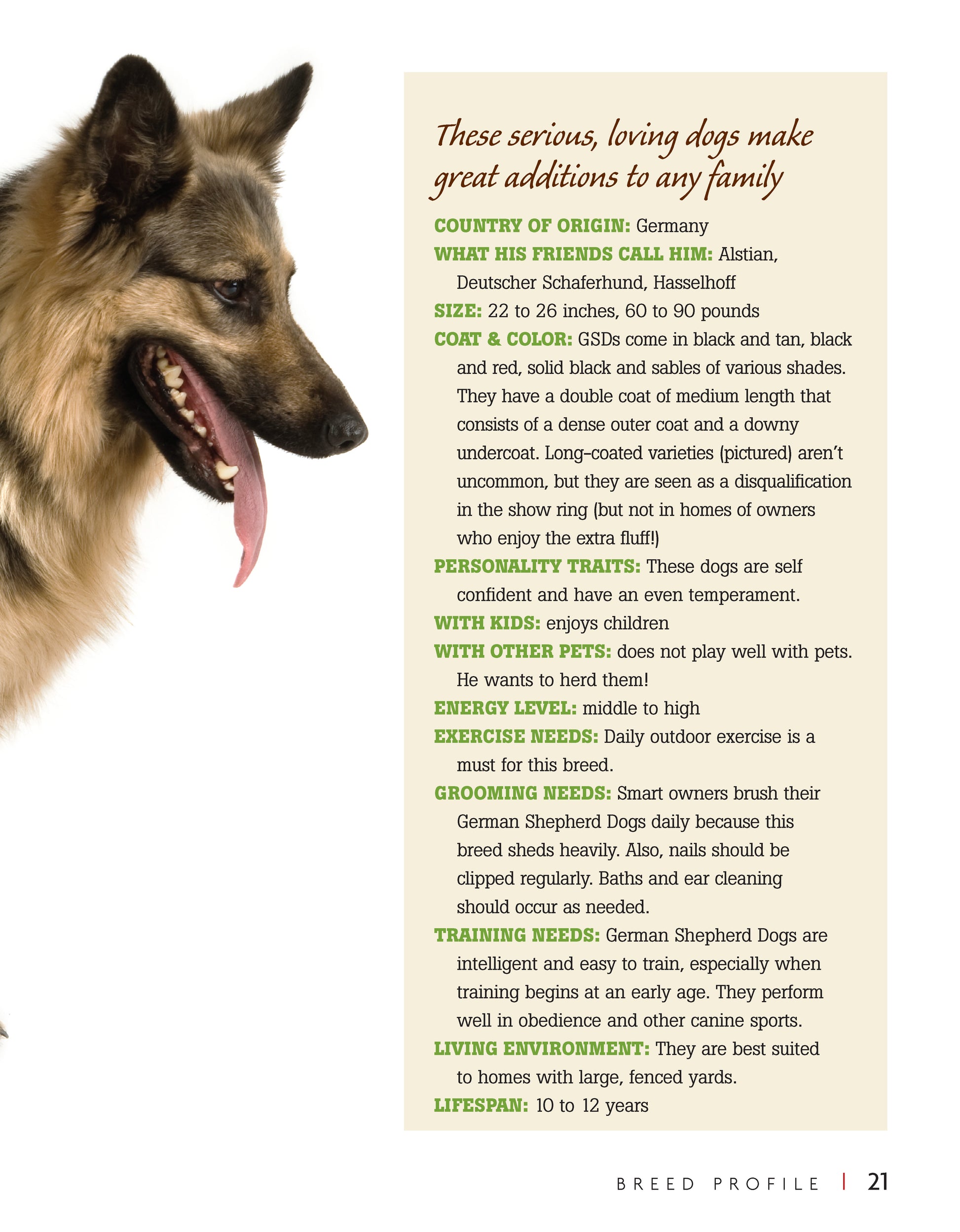 Dedicated to the world’s most accomplished working dog, respected guard dog, and beloved family companion, the German Shepherd Dog, this Smart Owner’s Guide, created by the editors at Dog Fancy magazine, offers the most up-to-date and accurate information every dog owner needs to become a well-informed caregiver for his dog. Illustrated with color photographs of adorable puppies and handsome adults, this easy-to-read primer is designed in a modern, lively manner that readers will find user-friendly and entertaining.Each Smart Owner’s Guide offers a description of the breed’s character and physical conformation, historical overview, and its attributes as a companion dog. The reader will find informative chapters on everything he or she needs to know about acquiring, raising, and training this remarkable purebred dog, including: finding a breeder and selecting a healthy, sound puppy; preparing for the puppy’s homecoming, shopping for supplies, and puppy-proofing the home; house-training; veterinary and home health maintenance; feeding and nutrition; and grooming. Obedience training for basic cues (sit, stay, heel, come, etc.) and solving potential problem behaviors (barking, chewing, aggression, jumping up, etc.) are addressed in separate chapters, as are activities to enjoy with the dog, including showing, agility, therapy work, and more.Entertaining tidbits and smart advice fill up colorful sidebars in every chapter, which the editors call ?It’s a Fact,” ?Smart Tip,” ?Notable & Quotable,” and ?Did You Know?” Real-life heroes and rescue stories are retold in full-page features called ?Pop Pups” and ?True Tails.” Recipes, training, and care tips are highlighted in the ?Try This” feature pages.The Smart Owner’s Guide series is the only series that offers readers an online component in which dog owners can join a breed-specific online club hosted by dogchannel.com. At Club GSD, owners of the breed can find forums, blogs, and profiles to connect with other breed owners, as well as charts and checklists that can be downloaded. More than just 20,000 pages of solid information, there’s a host of fun to be had at the club in the form of downloadable breed-specific e-cards, screensavers, games, and quizzes.The Resources section of the book includes contact information for breed-related organizations and rescues, as well as practical guidance on traveling with dogs, identification, and locating qualified professionals to assist the dog owner, such as pet sitters, trainers, and boarding facilities. This information-packed Smart Owner’s Guide is fully indexed.