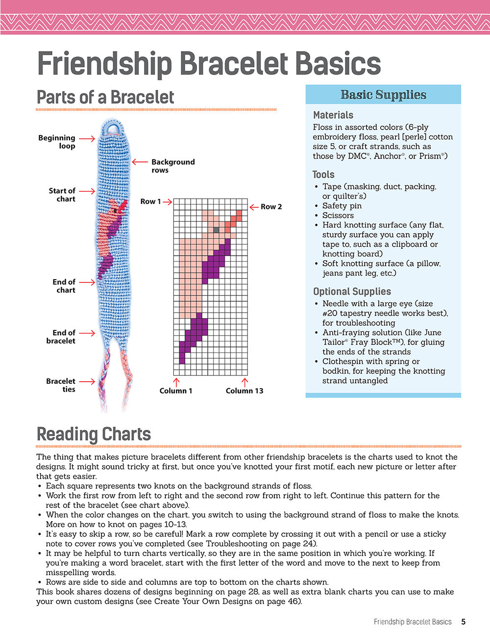 Learn the essential basics before you start creating your friendship bracelets, including: Parts of a Bracelet, Reading Charts, Choosing Colors, Determining Bracelet Sizes