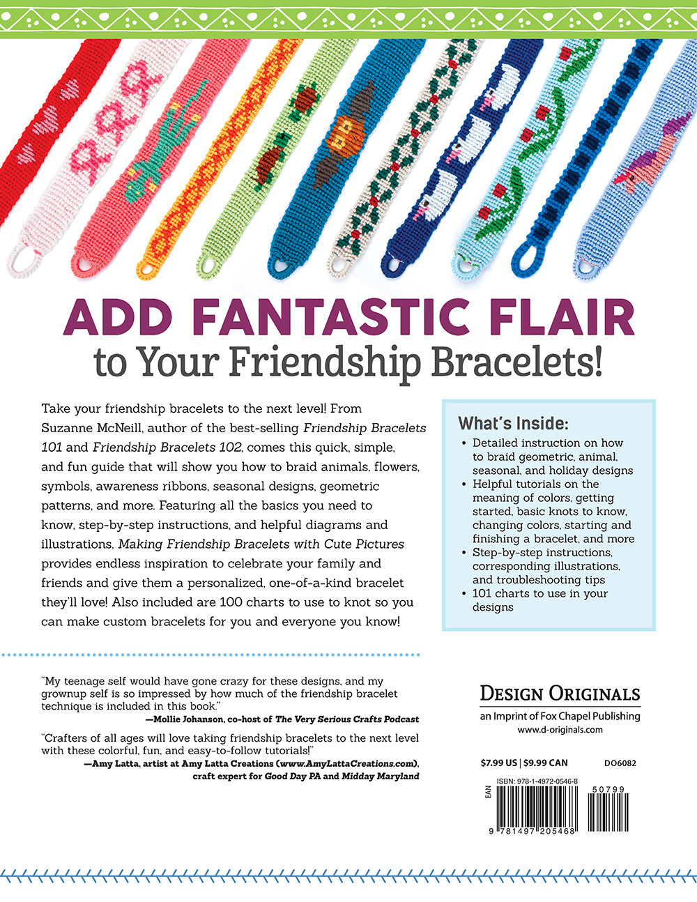 Give new style to the timeless craft of friendship bracelets! Learn how to make personalized gifts for your friends by adding pictures, shapes, symbols, and other charming images that will make your bracelet making pop! From the author of the best-selling Friendship Bracelets 101 and Friendship Bracelets 102, this quick and simple guide will show you how to take your knotted crafts to the next level! Also included is an inspiring tutorial on how to make your own original pattern. Featuring all the basics you need to know, step-by-step instructions, coordinating photography, and an inspirational gallery of fun designs, celebrate your friendships and give them a bracelet they’ll love! Author Suzanne McNeill has written more than 230 craft and hobby books that share her passion for creating. Designer, artist, columnist, TV personality, publisher, art instructor, and winner of the Craft and Hobby Association’s Industry Achievement Award, Suzanne has been called “the Trendsetter” of the arts and crafts industry.