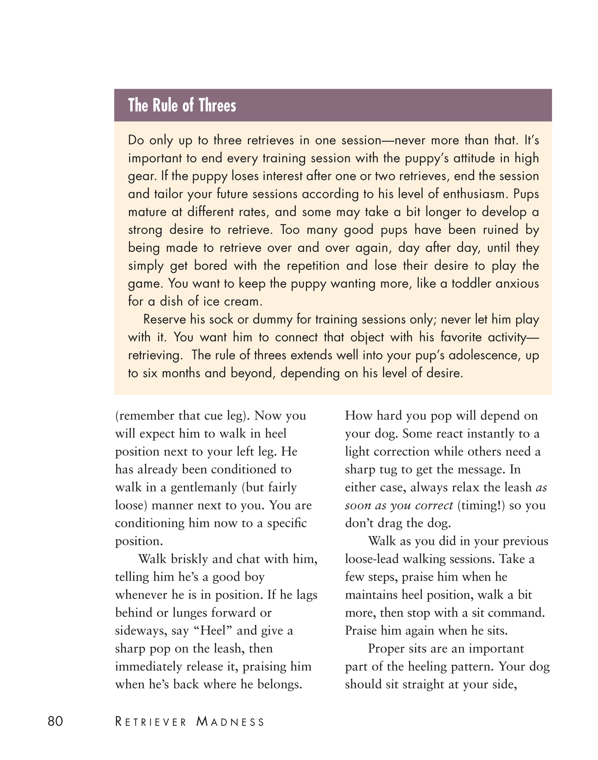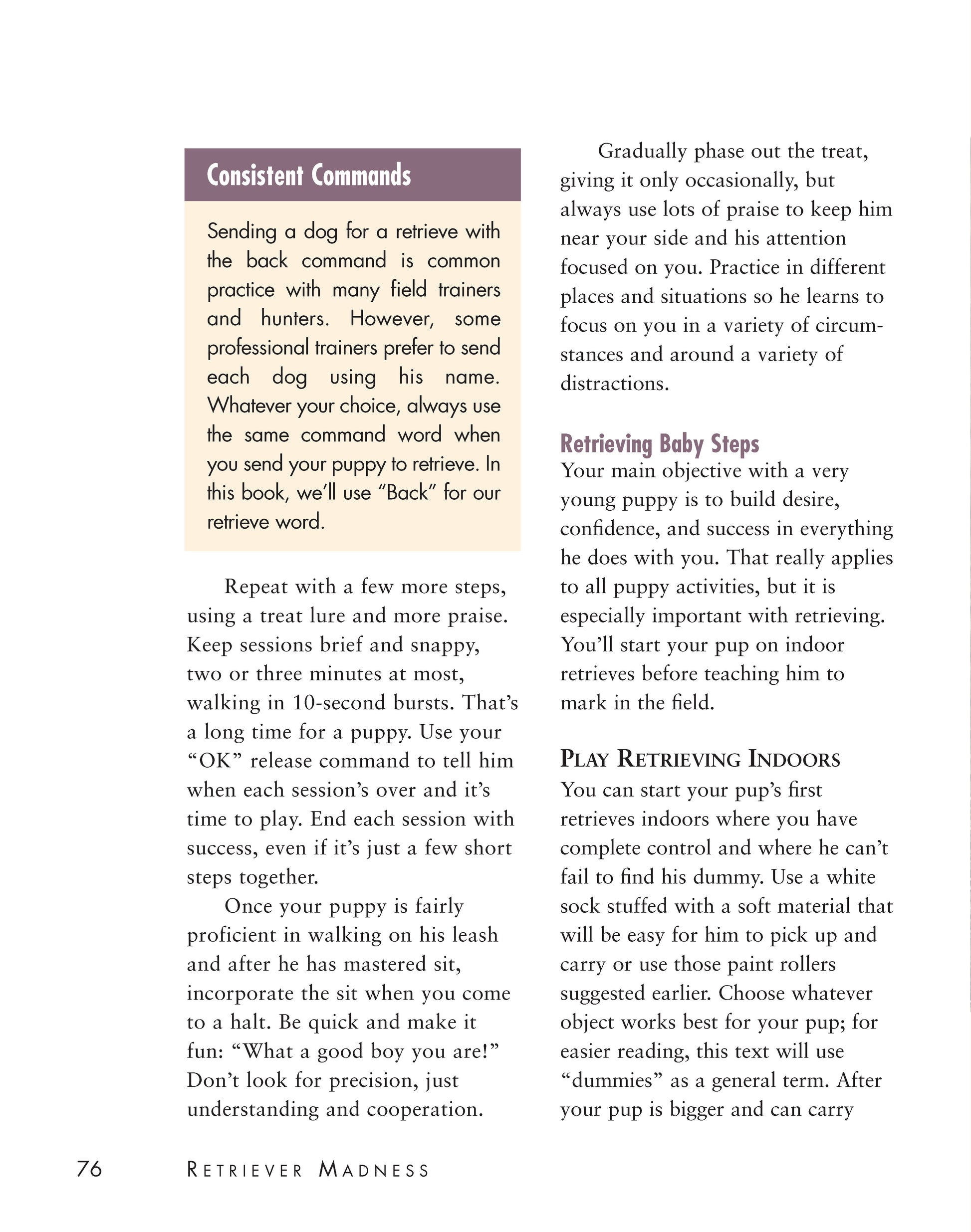 Author Nona Kilgore Bauer begins Retriever Madness with a chapter called ?Know Your Retrievers,” and few know their retrievers like this expert author, trainer, and breeder. Bauer introduces the readers to the six retrievers recognized by the American Kennel Club, among them two of the most popular companion dogs in the world, the Labrador Retriever and the Golden Retriever, along with other superb overachievers: the Chesapeake Bay Retriever, Flat-Coated Retriever, Curly-Coated Retriever, and Nova Scotia Duck Tolling Retriever.Geared toward readers who are interested in working with their retrievers in their bred-for capacity?hunting water fowl and upland game birds?Retriever Madness is the perfect primer to getting started in the field. The book offers advice on selecting a puppy with hunting potential, giving future owners insight on how to evaluate a puppy’s birdiness, independence, prey drive, and personality. The chapter on bringing the puppy home gives recommendations for basic training equipment, including leashes, collars, dummies, whistles, starting pistol and the like.Amateur retriever owners who hope to hunt with their dogs will find excellent advice for training for the puppy’s first twenty weeks of life, the most critical period for training any puppy. In addition to the basic commands (sit, down, stay), the author also explains the release command, whistle commands, forward and backward heeling, and wait.Four chapters are devoted to beginning field work, presenting diagrams and step-by-step instructions and covering such topics as puppy marks, throwing, water retrieves, steadying, force-fetching, marking, executing blind retrieves and more. The author offers remedies to commonly encountered problems in the field as well as a complete glossary of terminology that all readers will find helpful in understanding the lingo of the field retriever.