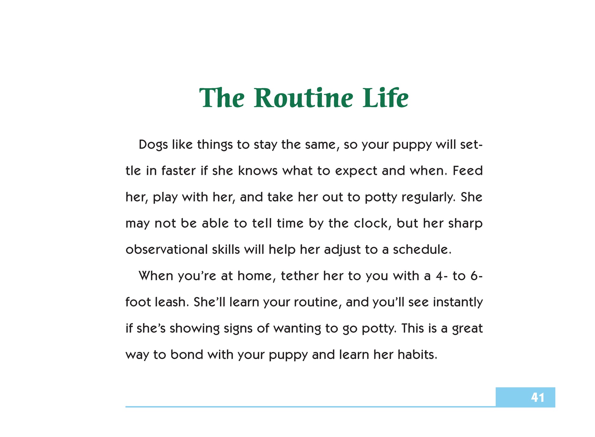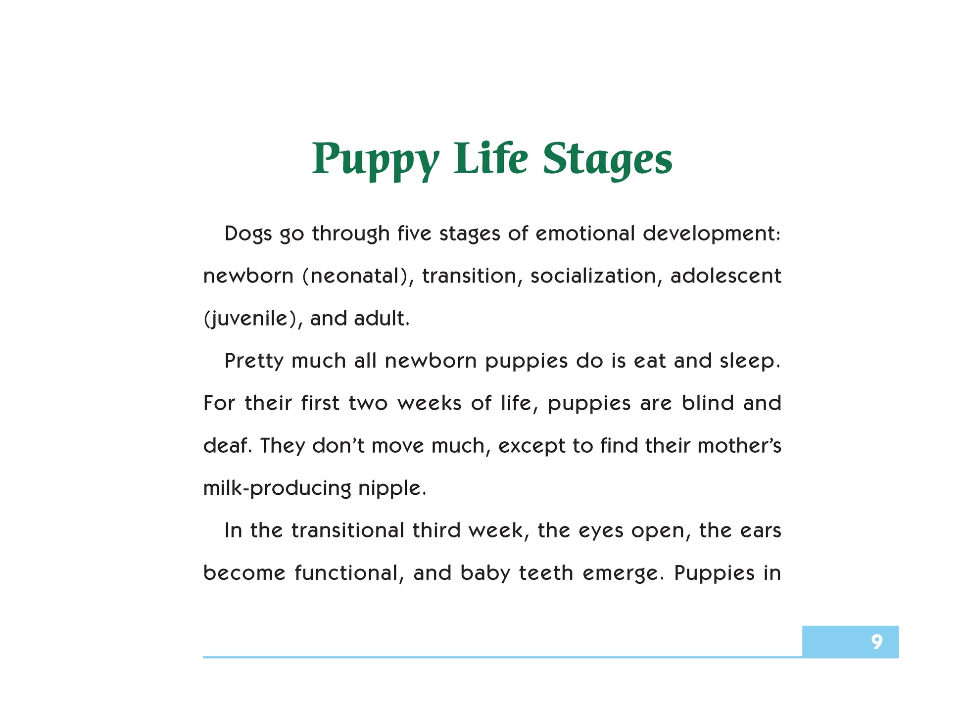 As author Kim Campbell Thornton begins this Simple Solutions guide, ?Dogs are known as man’s best friend, but they don’t come ready-made to take on this role.” Socialization unlocks the key to the human-dog bond and explains how well-mannered, well-adjusted dogs are made (not born).  A term  used by canine behaviorists and trainers, socialization is a fancy five-syllable word for ?getting friendly,” which doesn’t come naturally to all dogs. This handy little book begins with a discussion of puppy life stages, showing how puppies developmentally mature and what their ever-changing needs are.  New puppy buyers must be aware of the importance of the breeder’s role in socializing a litter of puppies, a critical process of introducing each pup to people, other dogs, and common everyday noises, during its critical developmental stages. Puppies raised without socialization (typically in a commercial breeding establishment, sometimes called a puppy mill) have a decided disadvantage and may never develop into normal, well-adjusted dogs. The book gives the new dog owner advice about planning social outings for the puppy so that he has ?People to Meet, Places to Go,” ever expanding his social graces and comfort level with strangers and the not-so-scary-after-all unknown. The author also provides excellent guidance on introducing a dog to a new baby as well as introducing an adopted dog into an established multipet household.
