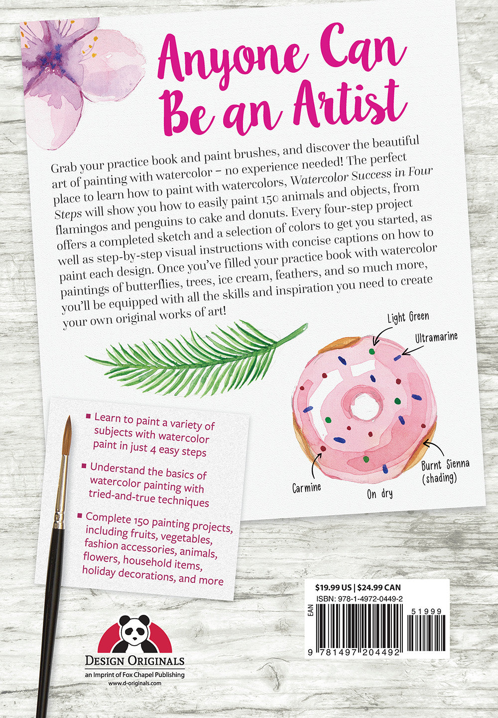 Grab your practice book, paint brushes, and discover the beautiful art of watercolor – no experience required! The ultimate beginner’s guide, Watercolor Success in Four Steps will teach you how to perfectly paint 150 objects, from fruits and flowers to animals, household items, and more! Understand the basics of watercolor with tried-and-true techniques and create beautiful watercolor paintings in just four simple steps. Each project offers a sample selection of colors to get you started, followed by approachable, step-by-step painting instructions to complete each design. Once you've accomplished each project, you’ll be equipped with all the skills and techniques you need to design and create your own watercolor works of art!